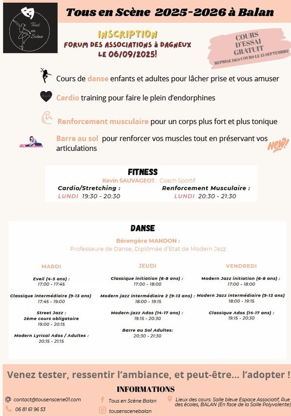 L’association "Tous en Scène" souhaite proposer des cours de Théâtre, de Danse Classique et Modern Jazz aux enfants et aux adultes de Balan.